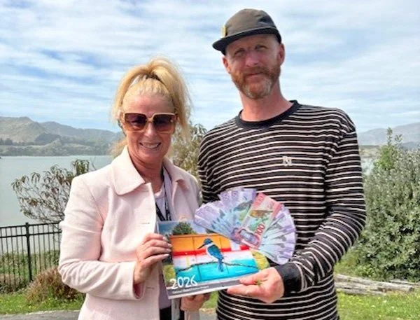 Mel Hillier, Graffiti Projects Coordinator from the Christchurch City Council presenting the proceeds of the Council's 2025 cabinets calendar initiative to Nat, our Learning Facilitator.